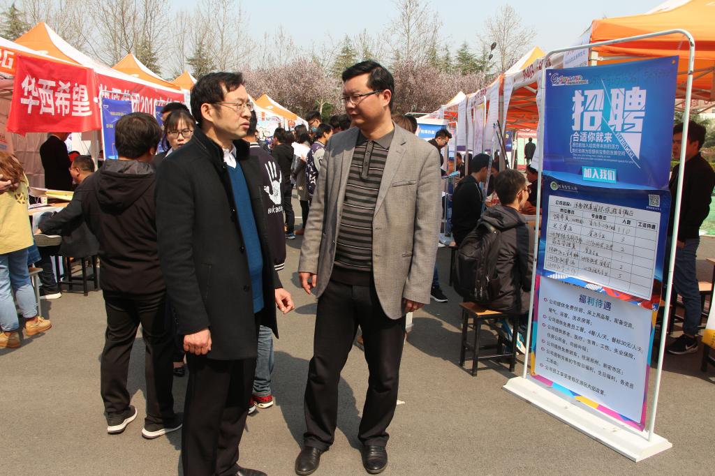3月24日,动物科技学院2018届毕业生专场招聘会在农林楼前成功举办。此次招聘会共吸引来自全国120余家企业参会,为毕业生提供就业岗位3000余个。我校招生就业处处长易军鹏在学院院长庞有志、党委书记孙东安、副院长王占彬、副院长丁轲、副书记山灵的陪同下到招聘会现场视察,与用人单位和毕业生进行交流。